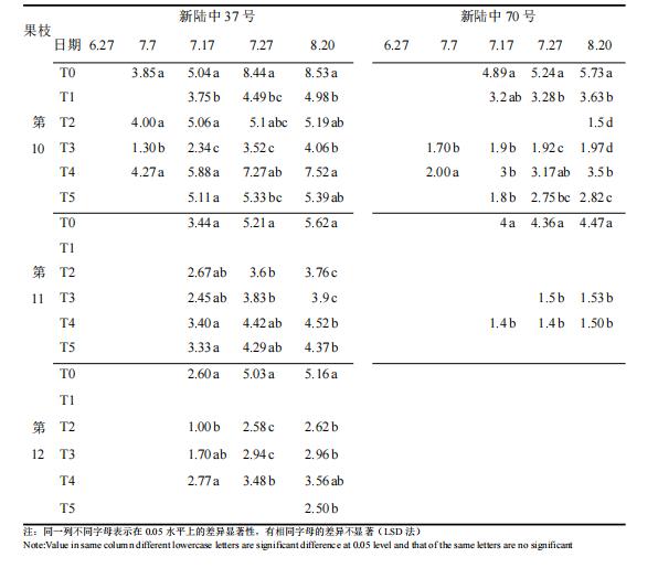 表2-2 不同處理下新陸中37號(hào)與新陸中70號(hào)的第6及以上各果枝長(zhǎng)(cm)